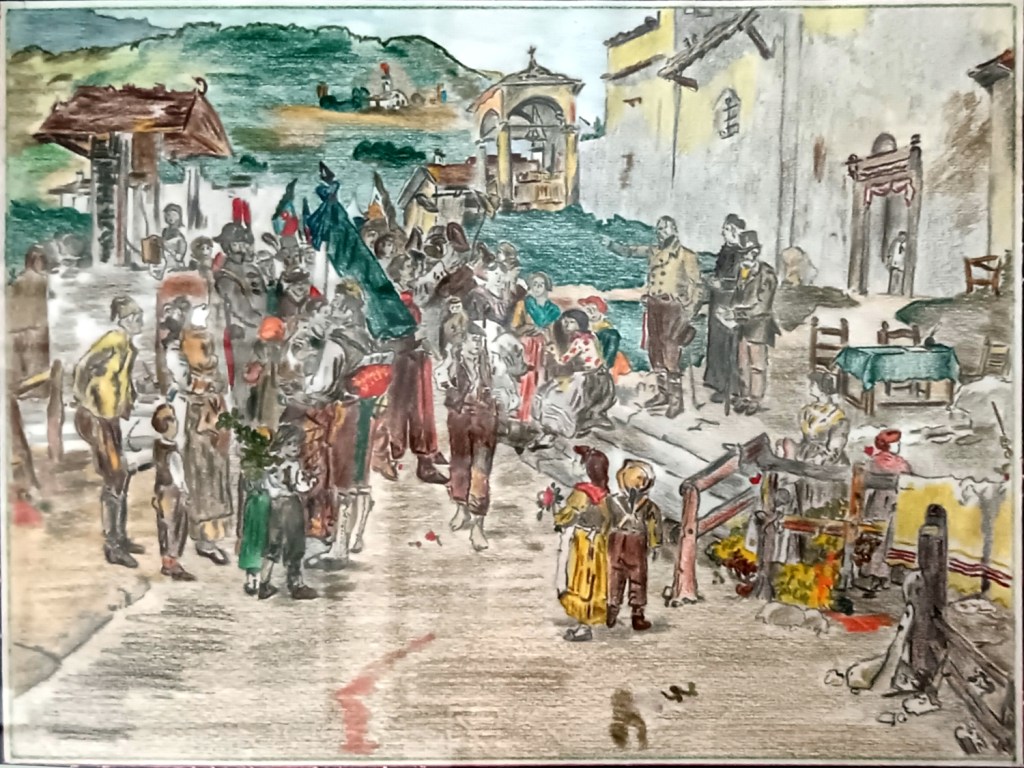 Ormai ci avevo preso gusto a tal punto che mi cimentavo nel riprodurre qualunque cosa mi intrigasse: scene di battaglie medievali tratte da un’enciclopedia per ragazzi, oppure le stesse illustrazioni dei libri di testo, tipo questa partenza di alcuni volontari di un paesino imprecisato durante le guerre risorgimentali. Mi piacevano le situazioni affollate, più personaggi comparivano più mi divertivo.