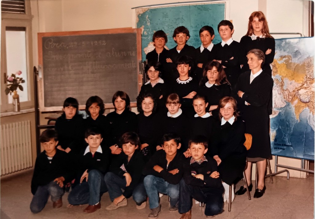 Io sono nell’ultima fila in alto, in piedi su una sedia, secondo da destra; di fianco a me, una mia compagna altissima che solo un fotografo poco avvezzo del mestiere avrebbe potuto disporre su un piedistallo. Sotto di lei, decisamente più giovane in foto di come apparisse dal vivo ai miei occhi di bambino, la famosa maestra. Alla sua sinistra, oltre la bella addormentata, la mia principessa, come si evince dallo sguardo franco e sereno, la bocca principescamente appena socchiusa e il colletto di sobria eleganza.